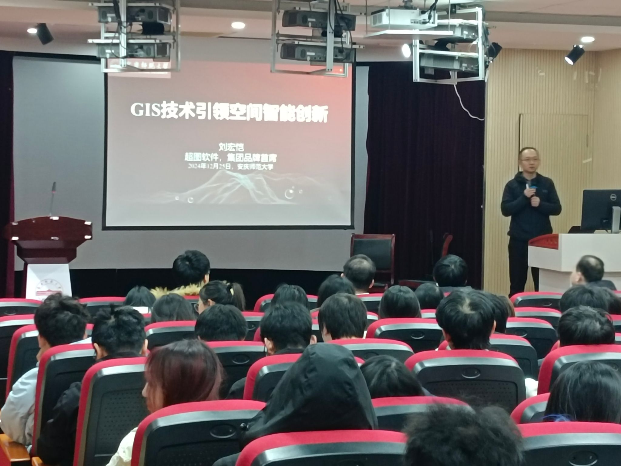 会后,刘宏恺主任就“GIS技术引领空间智能创新”课题为2023级、2024级地理科学专业本科生分享了一场学术盛宴。他详细介绍了空间智能创新相关产业、数据和技术,分享业界前沿信息,通过实例向学生展示了GIS技术广泛应用,加深学生对专业实践和应用领域的认识,引领学生们扩宽视野,接触校内外专业学习知识和资源。