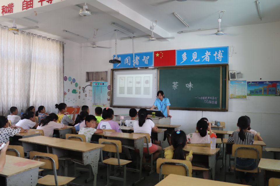 通过志愿者的讲解,同学们了解到红茶、绿茶、乌龙茶、普洱茶等茶种,也知道了它们的产地、形状和功效。在志愿者讲解后,同学们争先恐后地向老师提出问题。“茶的起源是哪里?”“喝茶对身体有什么益处?”志愿者老师耐心的一一回答他们的问题,并就同学们提出的问题进行扩展。